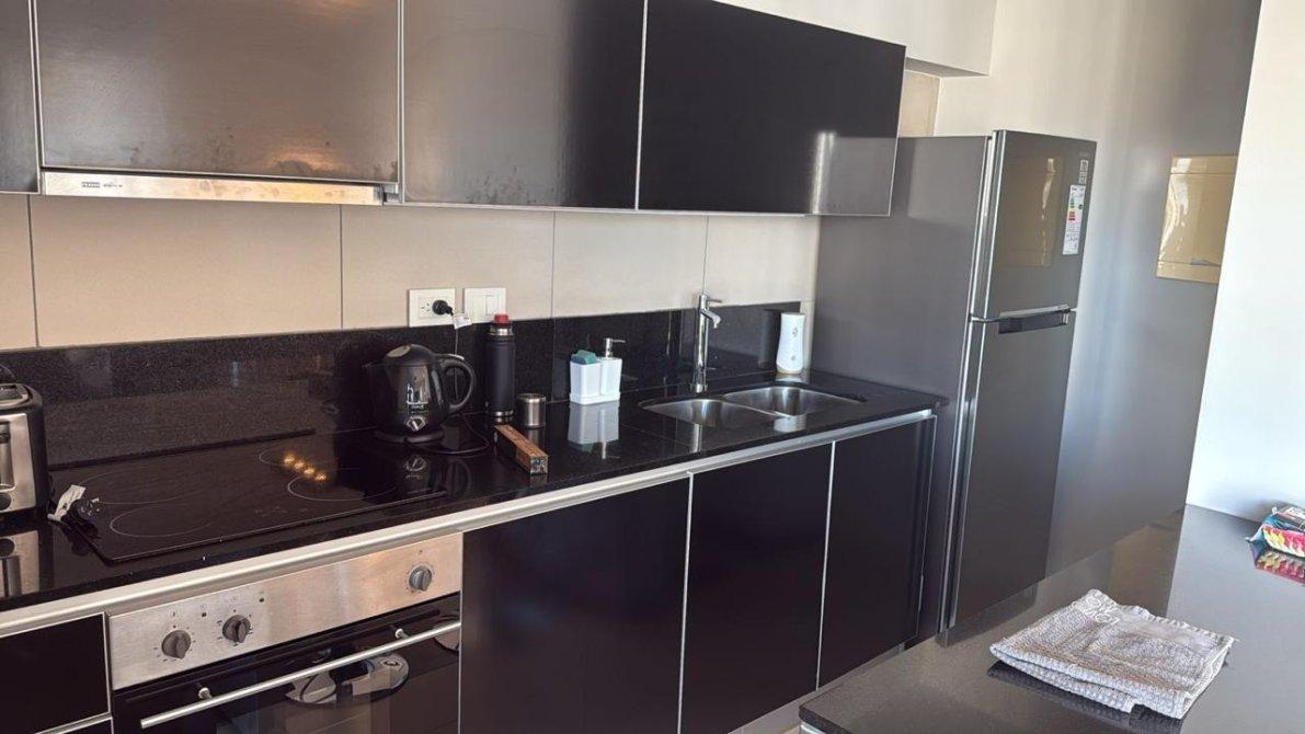 Cocina integrada con barra desayunadora. Incluye horno eléctrico, anafe vitrocerámico, muebles bajo mesada y alacenas de diseño moderno.