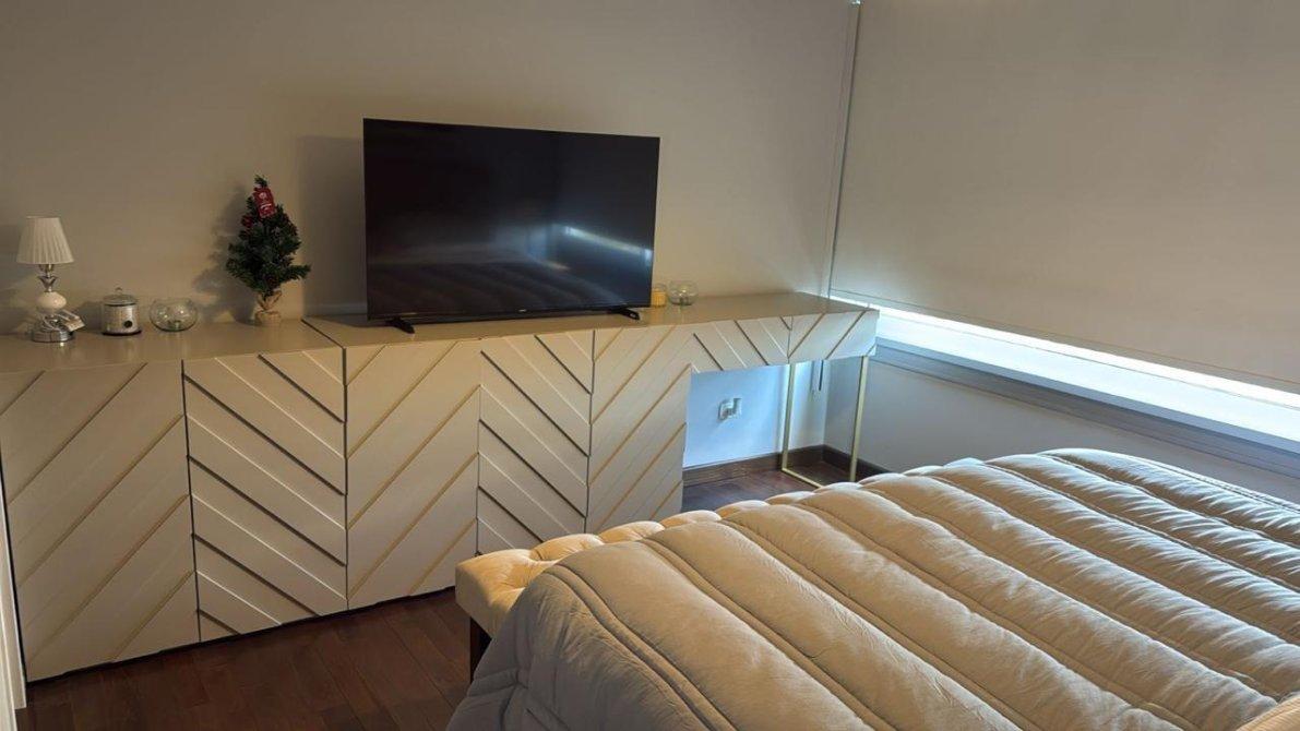 Living-comedor amplio con ventanales de pared a pared. Sistema eléctrico de cortinas roller doble capa: translúcida + black out automatizado.