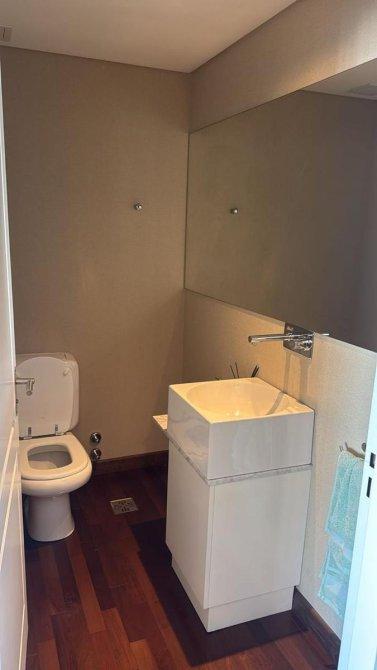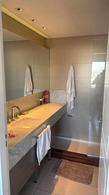 Baño en suite: ducha tipo lluvia, mampara de vidrio, mesada de mármol y detalles contemporáneos.