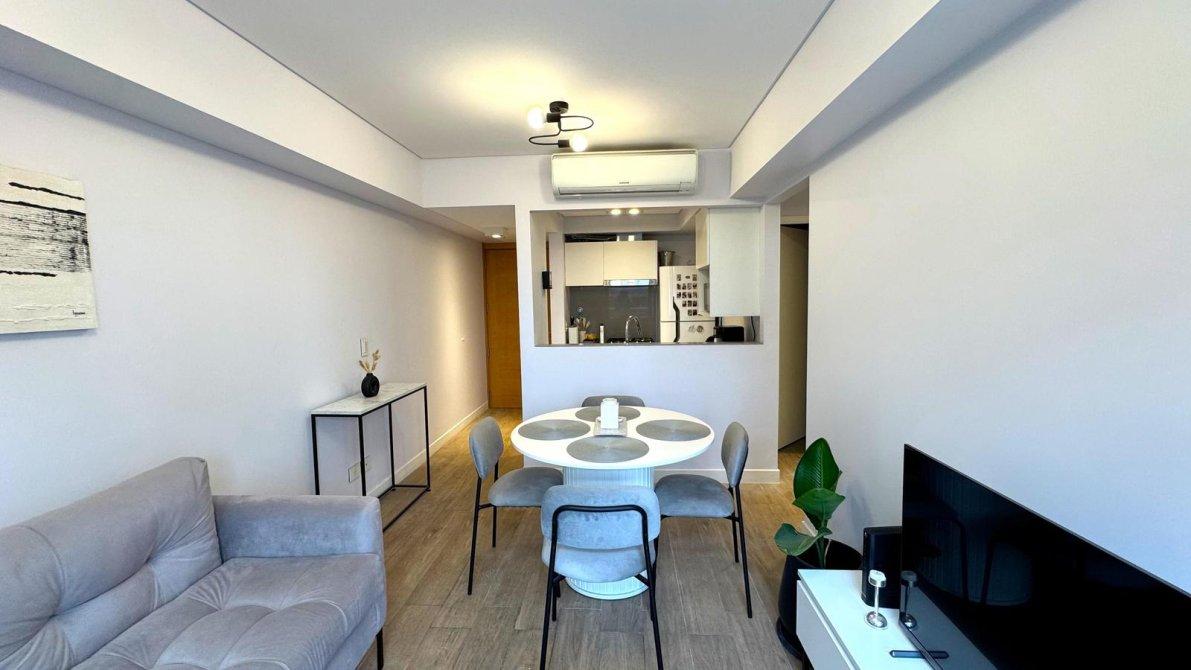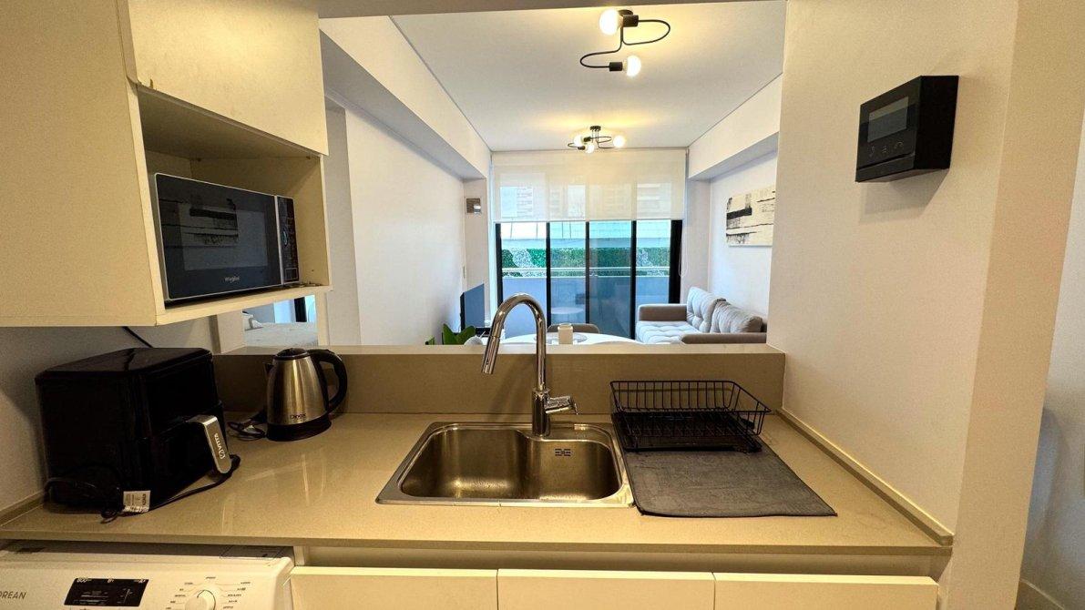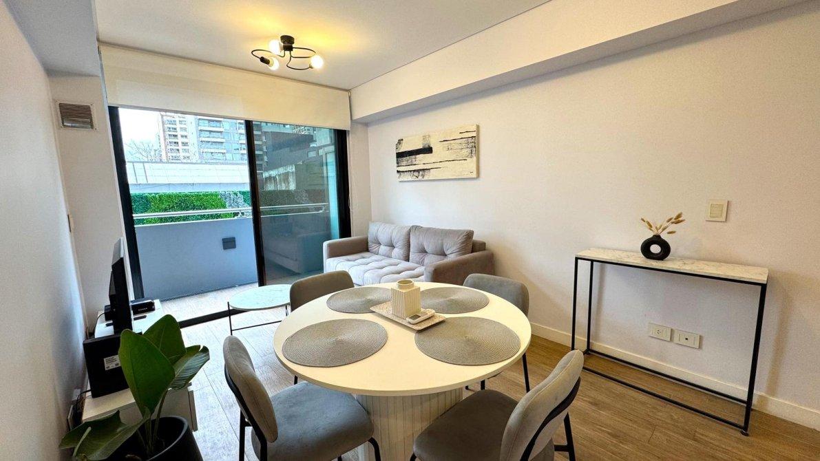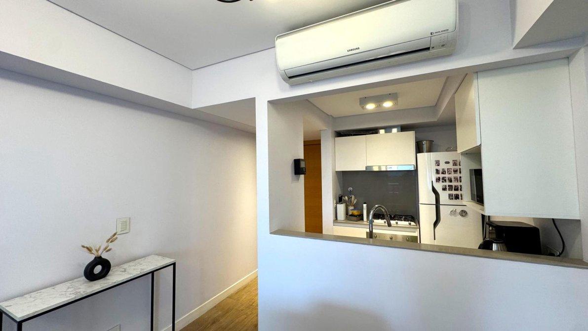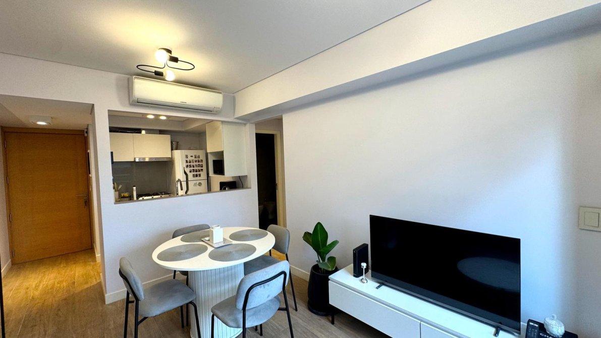 -2 ambientes bien distribuidos: living comedor integrado con cocina con muebles alto y bajo mesada (incluye horno empotrado, anafe y extractor de aire), dormitorio con vestidor y baño completo.