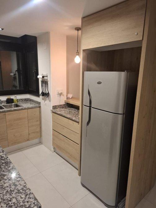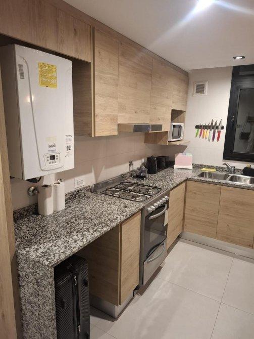-Cocina independiente con alacenas y bajo mesada en madera, mesada de granito, cocina a gas y heladera.